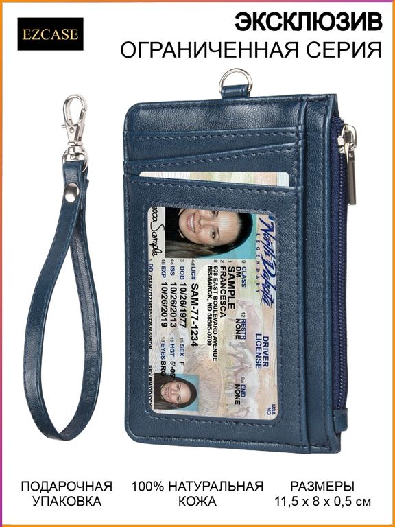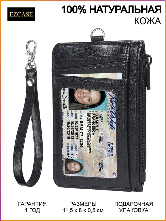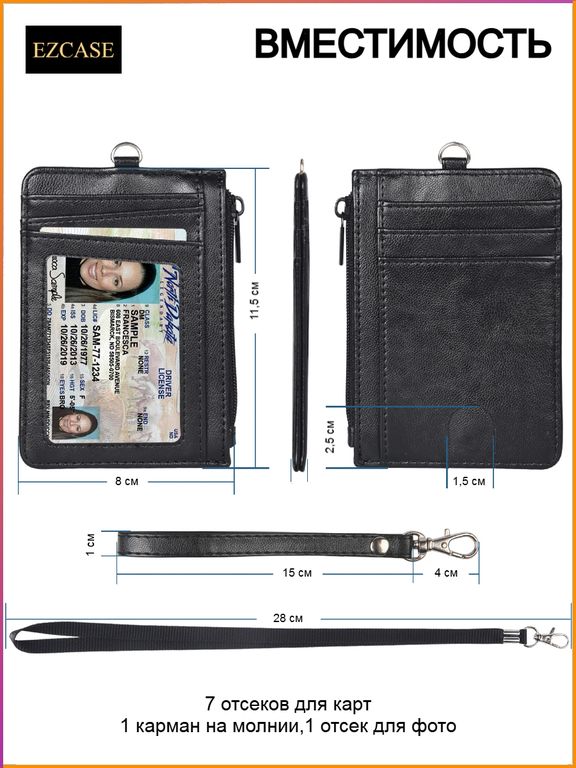 Гарания: 12 месяцев • Размеры: 11,5 x 8 см • Вместимость: 7 отсеков для карт, 1 карман на молнии и 1 окно для фото или бейджа