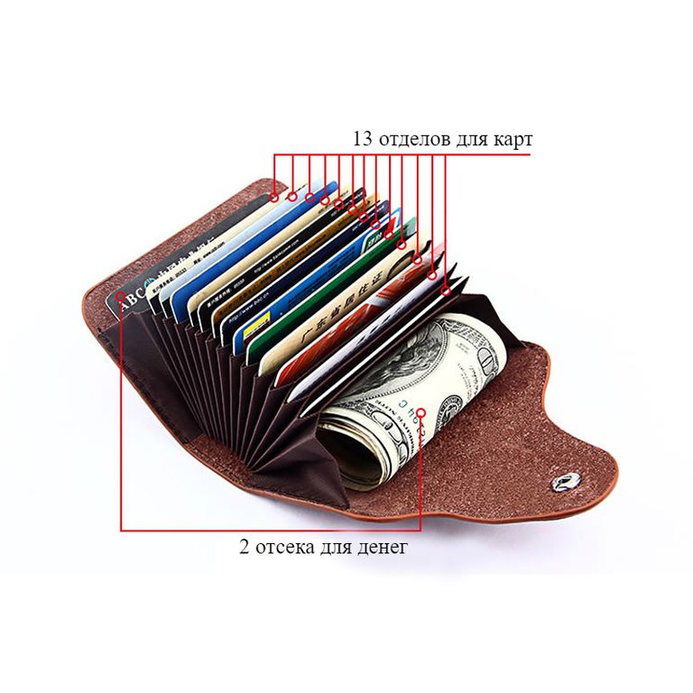 Вместимость (13 визиток и пластиковых дисконтных карт, 2 отдела для банкнот)